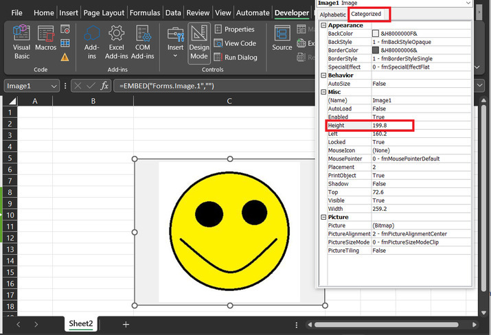 現在可以在建立的圖片控制元件內看到插入的圖片。使用者還可以根據需要更改插入圖片的高度。例如,這裡將透過點選高度按鈕將工作表高度修改為199.8。相應的快照如下所示
