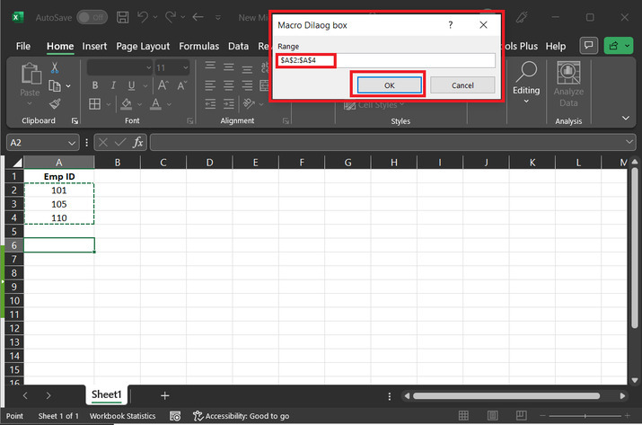 上述步驟將顯示一個“**宏對話方塊**”。在出現的對話方塊中,選擇範圍值,例如,對於此示例,我們將選擇從 A2 到 A4 的單元格。下面提供了相同的快照: