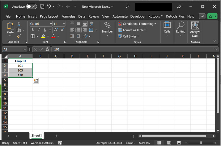 為了瞭解插入缺失連續資料數字或行的過程,使用者首先需要建立一些示例資料。對於此示例,我們將編寫一些隨機值,例如 101、105 和 110。請參考以下提供的資料快照。