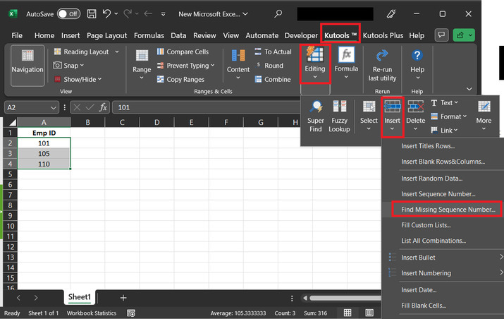 然後,單擊“**Kutools**”選項卡,單擊“**編輯**”磁貼,然後選擇“**插入**”選項卡,進一步選擇“**查詢缺失的序列號…**”。下面提供了相同的快照。