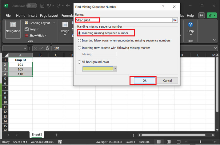 上述步驟將開啟一個“**查詢缺失的序列號**”對話方塊。在範圍標籤中,選擇範圍資料,例如,對於提供的案例,資料存在於 A2 到 A4 單元格中。然後在“**處理缺失的序列號**”中,選擇第一個單選按鈕“**插入缺失的序列號**”,最後單擊“**確定**”按鈕。下面提供了相同的快照。