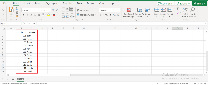 將使用者資料新增到工作表的單元格中。資料可以手動輸入到單元格中,也可以從其他地方複製和貼上。請參考下圖: