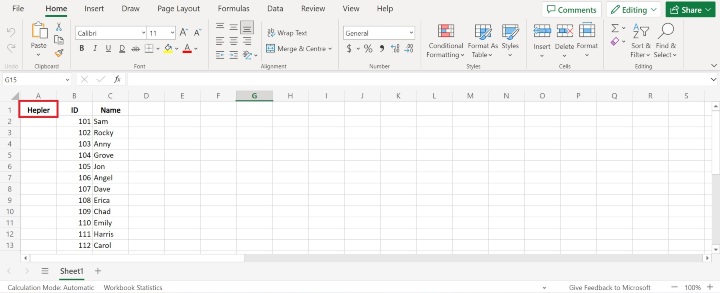 建立一個輔助列,並將其放在資料旁邊的空列中。將使用此列生成隨機數。請參考下圖: