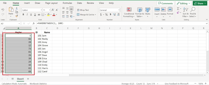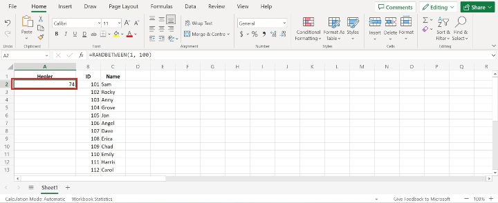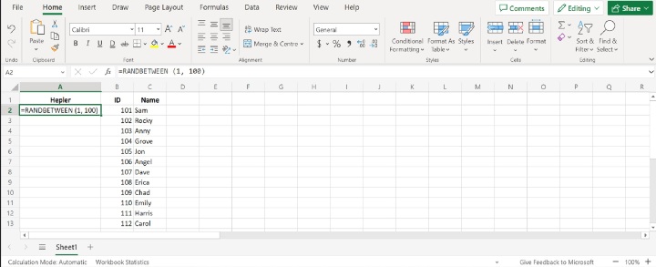 在輔助列的第一個單元格中輸入公式 **=RANDBETWEEN(起始數字, 結束數字)**。只需將“起始數字”替換為範圍中的較小值,“結束數字”替換為較大的值即可。公式可能如下所示:**=RANDBETWEEN(1, 100)**。