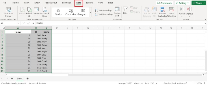 現在轉到“資料”選項卡。請參考下圖: