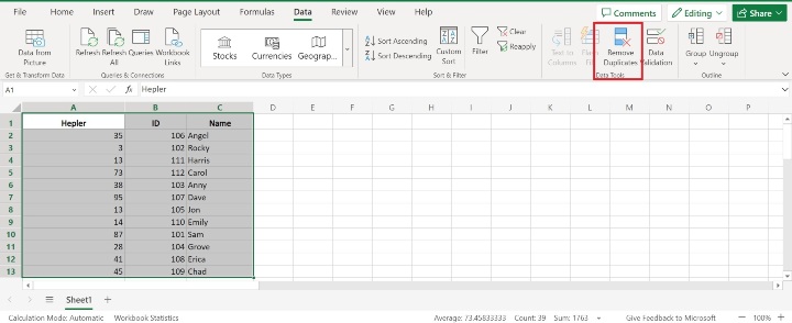 現在單擊 **“刪除重複項”** 按鈕,該按鈕位於 **“資料工具”** 中。請參考下圖: