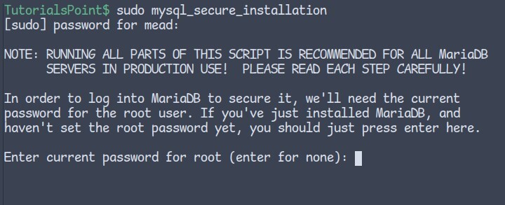 **設定 root 密碼** - 首先,它會要求您為當前資料庫設定密碼。由於我們尚未設定資料庫,因此只需留空並按 Enter 鍵。