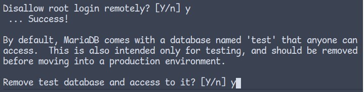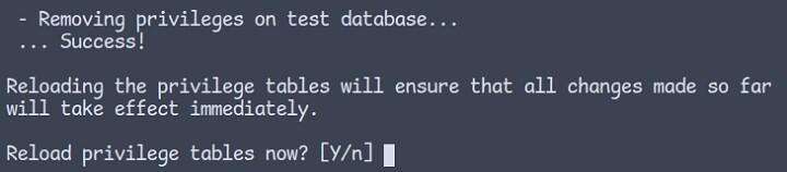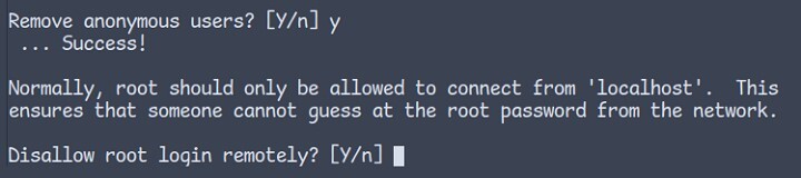 **停用遠端 root 登入** - 它會詢問您是否要停用遠端訪問。回答“是”(這意味著只有本地使用者可以訪問資料庫,而不是來自其他計算機的使用者)。