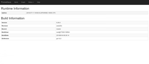 The -d option starts the Prometheus container to start in detached mode, meaning that the container will be started in the background and will not be terminated by pressing CTRL+C. The -p 9090:9090 option allows the Prometheus's web port (9090) and makes it reachable via the external IP address of the host system. The -v [...] option mounts the prometheus.yml configuration file from the host filesystem from the location within the container where Prometheus expects it (/etc/prometheus/prometheus.yml) The -config.file option is instruct the Dockers accordingly to the location of the Prometheus configuration file within the container. The -storage.local.path option configures the metrics storage location within the container. Finally, the -storage.local.memory-chunks option adjusts Prometheus's memory usage to the host system's very small amount of RAM (only 512MB) and small number of stored time series in this tutorial (just under 1000) It instructs Prometheus to keep only 10000 sample chunks in memory (roughly 10 chunks per series), instead of the default of 1048576. This is a value you will definitely need to tune when running Prometheus on a machine with more RAM and when storing more time serie Refer to Prometheus's storage documentation for detailed usage.