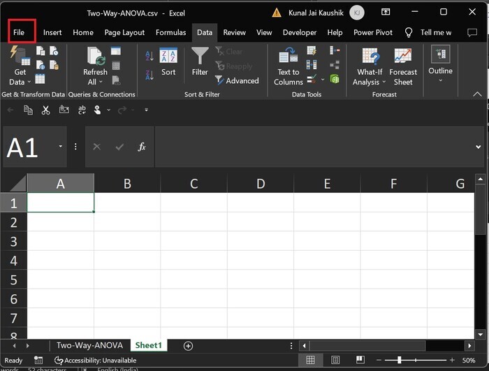 步驟 1 − 在MS Excel中開啟新的工作表,然後轉到檔案選項卡,如下面的圖片所示 −