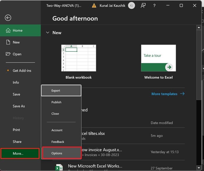 步驟 2 − 點選下拉選單中的更多…,然後點選選項,如下面的圖片所示 −