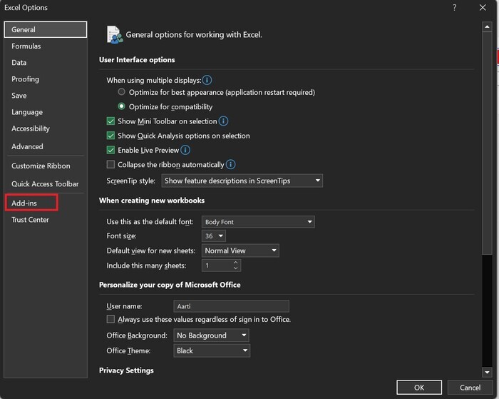步驟 3 − 將顯示“Excel 選項”對話方塊,然後從給定的列表中點選“載入項”選項,如下面的圖片所示 −
