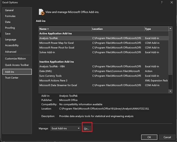 步驟 4 − 如您所見,對話方塊中顯示了多個載入項。要安裝分析工具庫,使用者必須點選轉到…按鈕,如下面的圖片所示 −