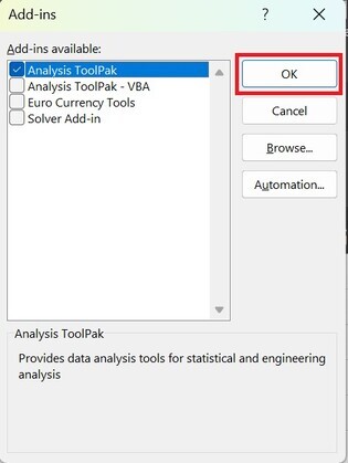 步驟 5 − 點選“分析工具庫”的複選框,然後按“確定”按鈕。
