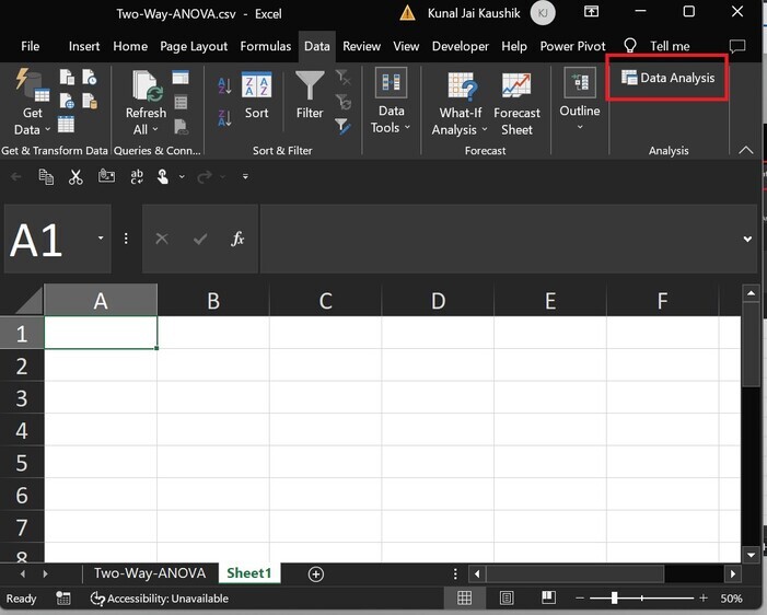 步驟 6 − 因此,分析工具庫已成功安裝。使用者可以充分利用它。當您轉到“資料”選項卡時,您可以看到“資料分析”選項可用,而這在之前分析功能區中並未顯示。