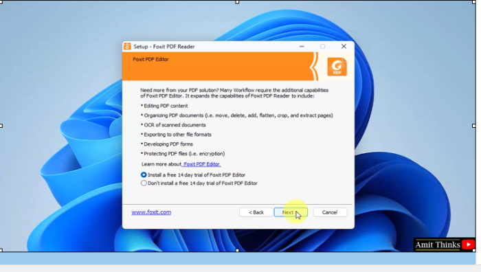 現在顯示“Foxit PDF 編輯器”部分。選擇“安裝 Foxit PDF 編輯器 14 天免費試用版”以安裝 PDF 編輯器來編輯 PDF。點選“下一步”: