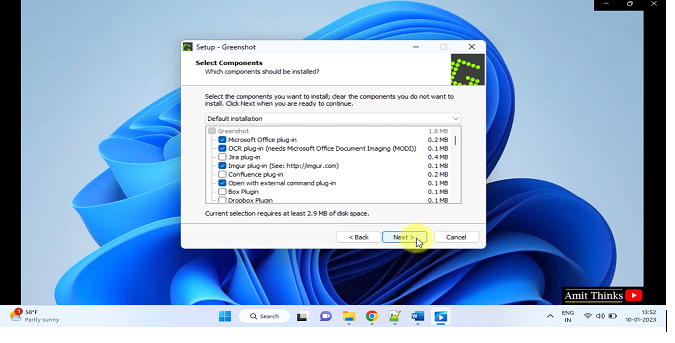 將會顯示選擇元件部分。這將為Greenshot設定Microsoft Office外掛、OCR外掛等。保持預設安裝,然後單擊下一步:
