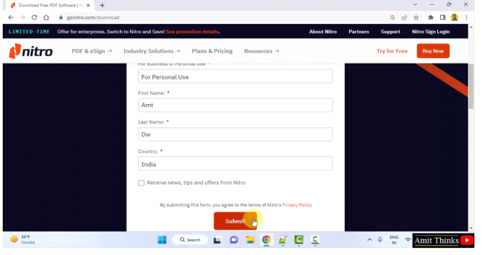 單擊“免費試用Nitro PDF Pro”按鈕後,將顯示一個表單。填寫此表單。它包括基本資訊,如姓名、姓氏、電子郵件地址等。
