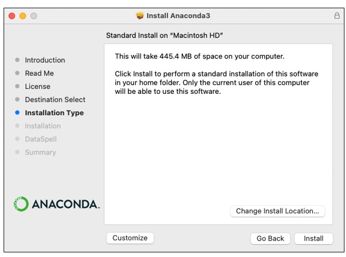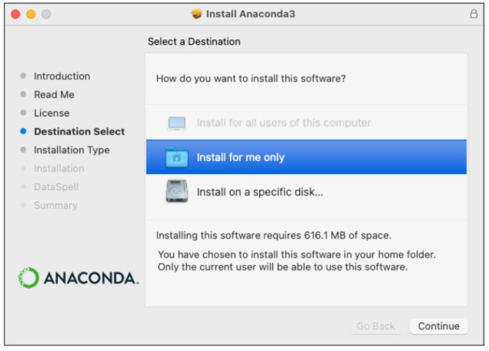 要為所有使用者或特定磁碟安裝 Anaconda Distribution,請單擊“更改安裝位置”。不建議這樣做。安裝是預設選項(也是推薦選項)。單擊“繼續”返回到“安裝型別”。