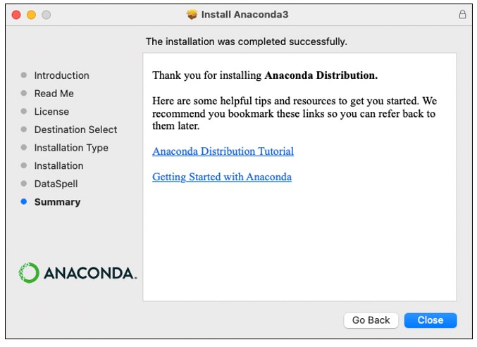 安裝程式完成並顯示“感謝您安裝 Anaconda<2/3>!”