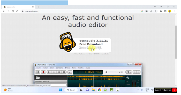 要在 Windows 上安裝 Ocenaudio,請開啟 Web 瀏覽器並訪問官方網站 ocenaudio.com,如下面的螢幕截圖所示。點選“免費下載”以在 Windows 上下載當前版本的 exe 檔案: