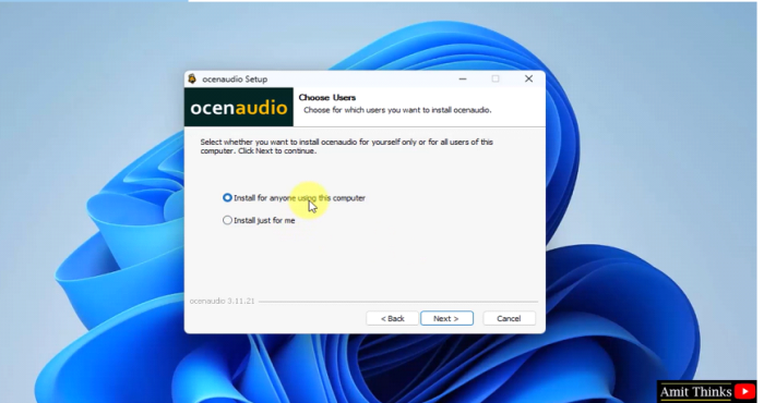 現在可見“選擇使用者”部分。在此,選擇要在此係統上為哪些使用者安裝 Ocenaudio。如果您是管理員,請選擇“為使用此計算機的任何人安裝”,然後點選“下一步”: