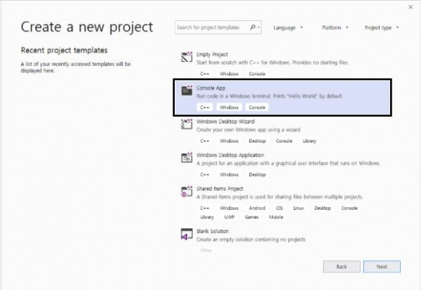 在此步驟中,您可以建立一個新專案並選擇C++控制檯應用程式模板。