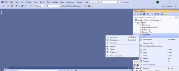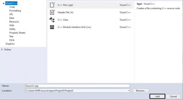 然後我們從那裡建立一個新的CPP檔案。然後點選新增。