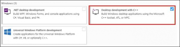 首先,啟動您的Visual Studio Installer程式,並將C++桌面開發作為工作負載新增到您最近的Visual Studio IDE版本中。