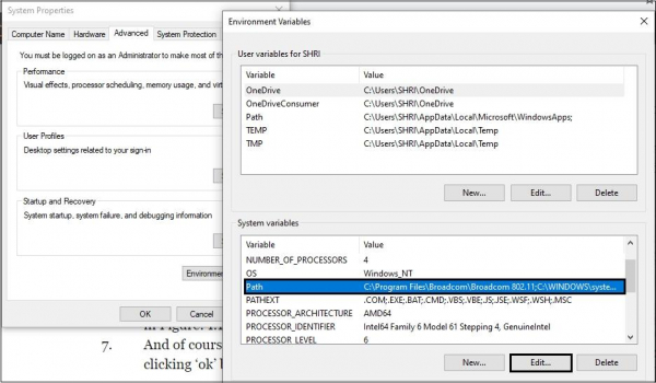 - 點選那裡的“環境變數”。將開啟另一個視窗。在“系統變數”中使用捲軸找到並選擇“path”。