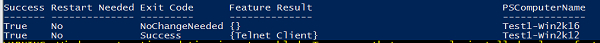 Invoke-Command -ComputerName Test1-Win2k12, Test1-Win2k16 -ScriptBlock{Install-WindowsFeature Telnet-Client}![]()