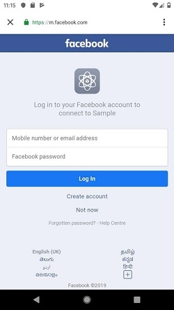 <?xml version="1.0" encoding="utf-8"?> <manifest xmlns:android="http://schemas.android.com/apk/res/android" package="app.com.sample"> <uses-permission android:name="android.permission.INTERNET" /> <application android:allowBackup="true" android:icon="@mipmap/ic_launcher" android:label="@string/app_name" android:roundIcon="@mipmap/ic_launcher_round" android:supportsRtl="true" android:theme="@style/AppTheme"> <activity android:name=".MainActivity"> <intent-filter> <action android:name="android.intent.action.MAIN" /> <category android:name="android.intent.category.LAUNCHER" /> </intent-filter> </activity> <meta-data android:name="com.facebook.sdk.ApplicationId" android:value="@string/facebook_app_id"/> <activity android:name="com.facebook.FacebookActivity" android:configChanges= "keyboard|keyboardHidden|screenLayout|screenSize|orientation" android:label="@string/app_name" /> <activity android:name="com.facebook.CustomTabActivity" android:exported="true"> <intent-filter> <action android:name="android.intent.action.VIEW" /> <category android:name="android.intent.category.DEFAULT" /> <category android:name="android.intent.category.BROWSABLE" /> <data android:scheme="@string/fb_login_protocol_scheme" /> </intent-filter> </activity> </application> </manifest>