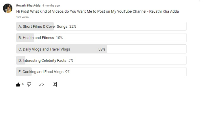 在這裡,我詢問我的觀眾 - 他們希望我在我的 YouTube 頻道上釋出什麼型別的影片。他們中的大多數回覆 - 日常影片日誌和旅行影片日誌。