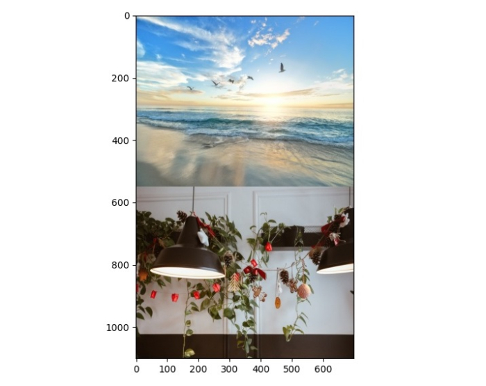 # import required library import cv2 import matplotlib.pyplot as plt # read two input images img1 = cv2.imread('birds.jpg') img2 = cv2.imread('lamp.jpg') # both image height and width should be same img1 = cv2.resize(img1, (700, 550)) img2 = cv2.resize(img2, (700, 550)) # join the two images vertically img = cv2.vconcat([img1, img2]) # Convert the BGR image to RGB img = cv2.cvtColor(img, cv2.COLOR_BGR2RGB) plt.imshow(img) plt.show()