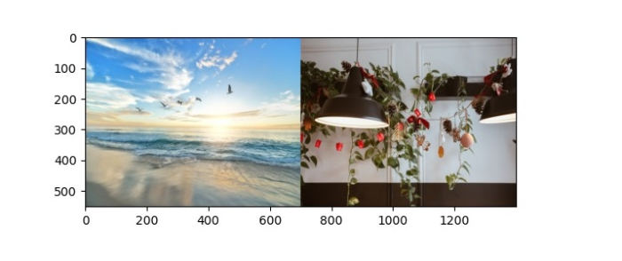 # import required library import cv2 import matplotlib.pyplot as plt # read two input images img1 = cv2.imread('birds.jpg') img2 = cv2.imread('lamp.jpg') # both image height and width should be same img1 = cv2.resize(img1, (700, 550)) img2 = cv2.resize(img2, (700, 550)) # join the two images horizontally img = cv2.hconcat([img1, img2]) # Convert the BGR image to RGB img = cv2.cvtColor(img, cv2.COLOR_BGR2RGB) plt.imshow(img) plt.show()