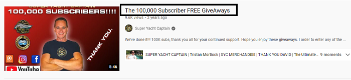 例如,計劃在您達到 10 萬或 100 萬訂閱者里程碑時,用免費贈品獎勵您的訂閱者。以下是由 Super Yacht Captain YouTube 頻道釋出的影片,該頻道在 YouTube 頻道達到 10 萬訂閱者時計劃了贈品。