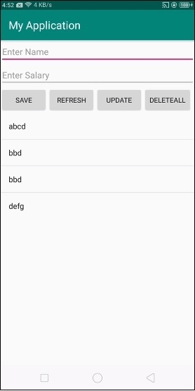 在上面的程式碼中,我們使用了名稱和薪資作為編輯文字,當用戶點選儲存按鈕時,它會將資料儲存到 SQLite 資料庫中。插入值後,點選重新整理按鈕以**按順序**更新列表檢視中的資料。如果使用者點選更新按鈕,它將更新資料。