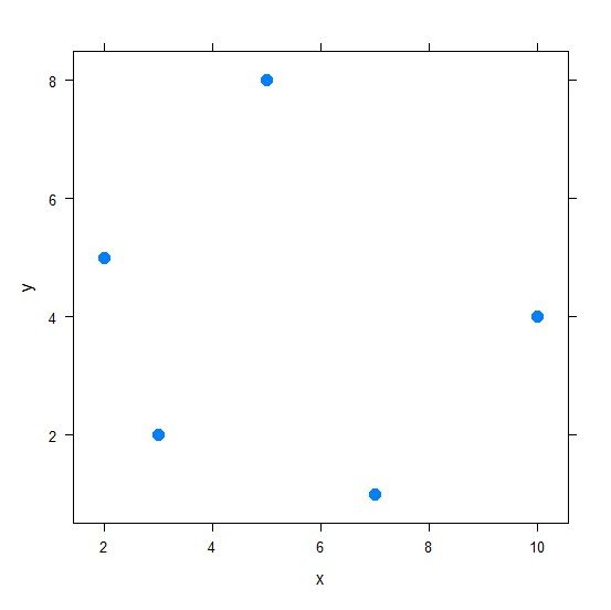 library(lattice) xyplot(y~x,data=data.frame(x,y),pch=20,cex=2)
