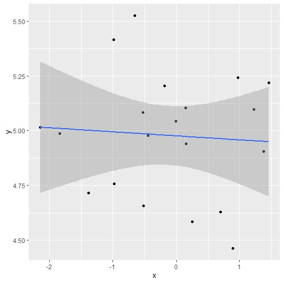 x<-rnorm(20) y<-rnorm(20,5,0.24) df<-data.frame(x,y) library(ggplot2) ggplot(df,aes(x,y))+geom_point()+stat_smooth(method="lm") `geom_smooth()` using formula 'y ~ x'