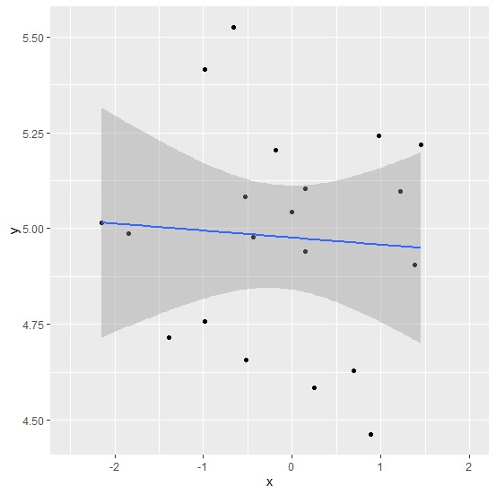 x<-rnorm(20) y<-rnorm(20,5,0.24) df<-data.frame(x,y) library(ggplot2) ggplot(df,aes(x,y))+geom_point()+stat_smooth(method="lm")+xlim(-2.5,2) `geom_smooth()` using formula 'y ~ x'