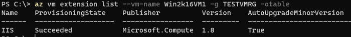PS C:\> az vm extension list --vm-name Win2k16VM1 -g TESTVMRG -otable