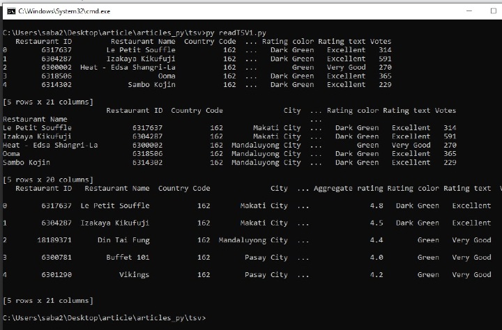 import pandas as pdd dff1 = pdd.read_table("C:/Users/saba2/Desktop/article/articles_py/tsv/zomato.tsv",delimiter='\t') print(dff1.head()) dff2 = pdd.read_table('C:/Users/saba2/Desktop/article/articles_py/tsv/zomato.tsv', delimiter='\t',index_col=1) print(dff2.head()) dff3 = pdd.read_table('C:/Users/saba2/Desktop/article/articles_py/tsv/zomato.tsv', delimiter='\t',skiprows=range(3,6)) print(dff3.head())