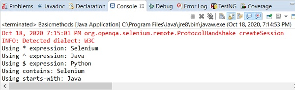 import org.openqa.selenium.WebDriver; import org.openqa.selenium.chrome.ChromeDriver; import org.openqa.selenium.WebElement; import org.openqa.selenium.By; public class PartialMatchId{ public static void main(String[] args) { System.setProperty("webdriver.chrome.driver", "C:\Users\ghs6kor\Desktop\Java\chromedriver.exe"); WebDriver driver = new ChromeDriver(); driver.get("https://tutorialspoint.tw/about/about_careers.htm"); // identify element with partial id match with * in css WebElement l=driver.findElement(By.cssSelector("input[id*='id']")); l.sendKeys("Selenium"); // obtain the value entered with getAttribute method System.out.println("Using * expression: " +l.getAttribute("value")); l.clear(); // identify element with partial id match with ^ in css WebElement m=driver.findElement(By.cssSelector("input[id^='gsc']")); m.sendKeys("Java"); // obtain the value entered with getAttribute method System.out.println("Using ^ expression: " +m.getAttribute("value")); m.clear(); // identify element with partial id match with $ in css WebElement n = driver.findElement(By.cssSelector("input[id$='id1']")); n.sendKeys("Python"); // obtain the value entered with getAttribute method System.out.println("Using $ expression: " +n.getAttribute("value")); n.clear(); // identify element with partial id match with contains in xpath WebElement o=driver.findElement(By.xpath("//input[contains(@id,'id')]")); o.sendKeys("Selenium"); // obtain the value entered with getAttribute method System.out.println("Using contains: " +o.getAttribute("value")); o.clear(); // identify element with partial id match with starts-with in xpath WebElement p=driver.findElement(By.xpath("//input[starts-with(@id,'gsc')]")); p.sendKeys("Java"); // obtain the value entered with getAttribute method System.out.println("Using starts-with: " +p.getAttribute("value")); p.clear(); driver.close(); } }