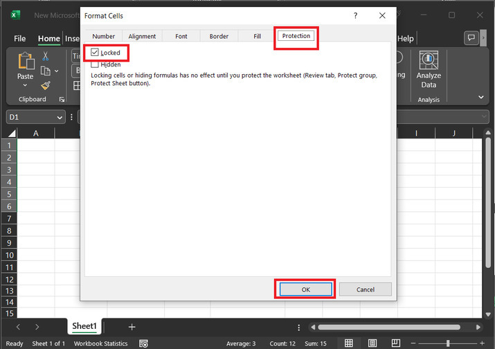 在所有可用選項卡中,選擇**“保護”**選項卡,然後取消選中**“鎖定”**選項。最後,單擊**“確定”**按鈕。