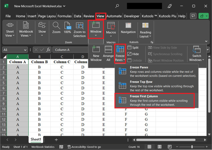 轉到“檢視”選項卡,然後選擇“視窗”選項。之後單擊“凍結窗格”,然後進一步選擇“凍結首列”選項。此選項將允許使用者凍結提供的 Excel 工作表的第一列。