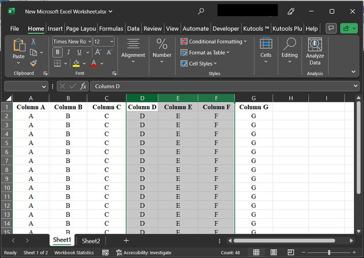 在 kutool 中,使用者需要選擇要凍結先前資料的其他列。例如,如果使用者想要凍結 A、B 和 C 列,則選擇 D、E 和 F 列。要選擇 D、E 和 F 列,首先單擊 D 的列標題,然後按“Ctrl”鍵,同時單擊 E 和 F 列標題。為了更精確地理解,請考慮以下給出的 Excel 工作表的快照。