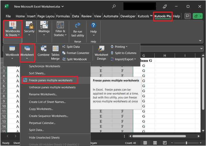 現在,轉到“Kutool Plus”選項卡,然後單擊“工作簿和工作表”選項卡,然後單擊“工作表”選項,然後選擇“凍結多個工作表中的窗格”,如下所示: