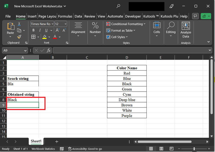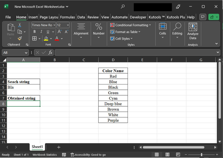 輸入公式後,按“Enter”鍵。這將顯示資料值“black”到A8單元格。因為Black等同於傳遞的部分字串“bla”。