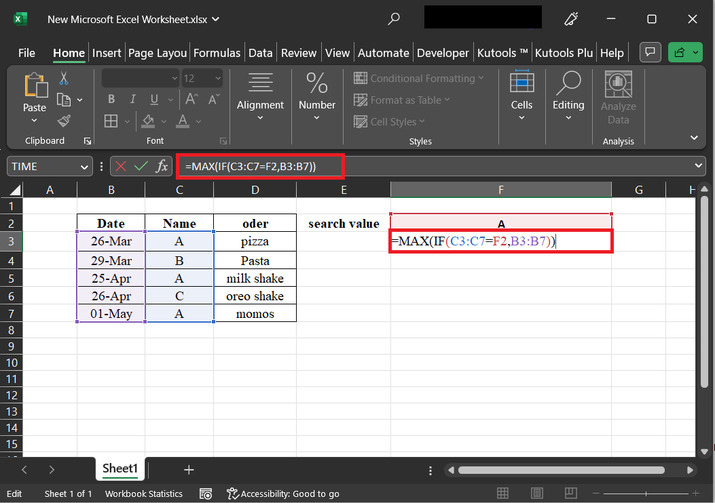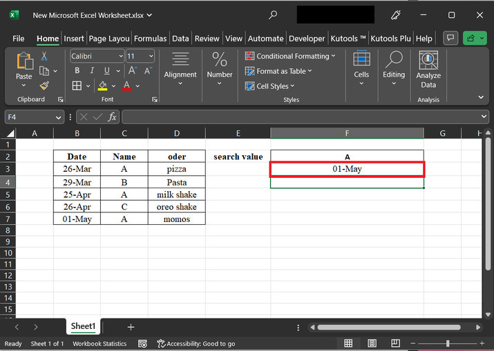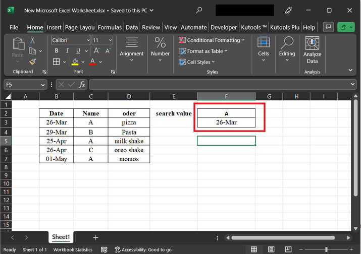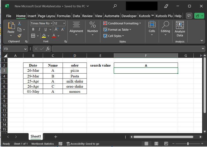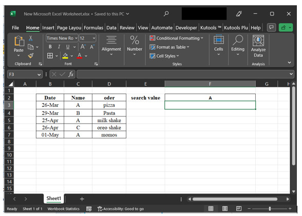 考慮以下給定的Excel工作表。提供的Excel工作表包含三列。第一列包含日期,第二列包含名稱,第三列包含訂單項名稱。在此Excel工作表中,還將在單元格E2處建立一個搜尋值標題。單元格F2包含使用者將搜尋所需資料的資料值。