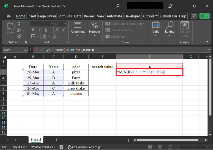 之後,轉到單元格F3,貼上公式“=MIN(IF(C3:C7=F2,B3:B7))”。為了更好地解釋,請考慮以下給定的Excel電子表格 -